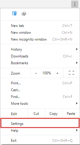 برای پاک کردن کش مرورگر گوگل کروم ابتدا روی آیکون سه نقطه که برای باز کردن منو این مرورگر هست کلیک کنید یا اینکه از دکمههای ترکیبی ALT + E استفاده کنید تا منو مرورگر مشابه تصویر زیر براتون باز بشه. سپس روی گزینه Settings کلیک کنید تا به صفحه تنظیمات مرورگر گوگل کروم هدایت بشید.