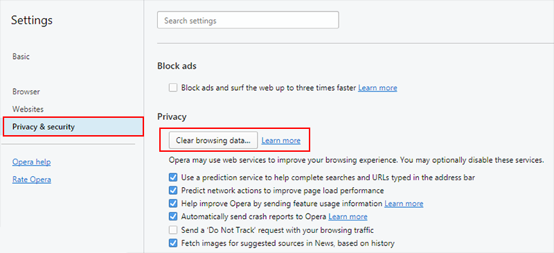 در این مرحله به صفحه تنظیمات مرورگر اپرا هدایت میشید که باید ابتدا مشابه تصویر زیر روی تب Privacy & Security که در سمت چپ قرار داره کلیک کنید.