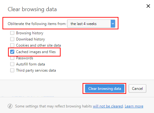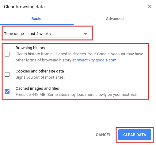 حالا همونطور که در تصویر میبینید ابتدا از گزینه Time range بازه زمانی برای خالی کردن کش مرورگر گوگل کروم را انتخاب کنید. این بازه زمانی میتونه بر اساس ساعت اخیر، یک روز پیش(24 ساعت پیش)، یک هفته پیش، چهار هفته پیش و کل بازه زمانی که مرورگر رو نصب کردید باشه. سپس گزینه Cached images and files را انتخاب کنید تا تنها تصاویر و فایلهایی که کش شده پاک شوند. در صورت انتخاب سایر گزینهها میتونید علاوه بر کش کوکی، تاریخچه و سایر دادههای مرورگر رو هم حذف کنید. بعد از اینکه انتخاب کردید پاک کردن کش مرورگر گوگل کروم بر اساس بازه زمانی دلخواه پاک بشه روی دکمه آبی رنگ CLEARE DATA کلیک کرده و منتظر بمونید تا بر اساس حجم فایلها کش مرورگر خالی بشه و پنجره بسته بشه.