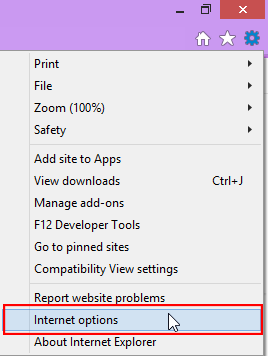 برای پاک کردن کش مرورگر اینترنت اکسپلورر ابتدا روی آیکون چرخ دنده مرورگر که در گوشه سمت راست قرار داره کلیک کنید. سپس روی گزینه internet options کلیک کنید.