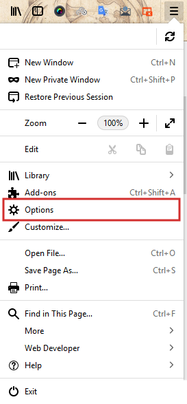 برای پاک کردن کش مرورگر فایرفاکس ابتدا روی آیکون سه خط گوشه مرورگر که برای باز کردن منو این مرورگر هست کلیک کنید. سپس روی گزینه Preferences یا options کلیک کنید تا به صفحه تنظیمات مرورگر فایرفاکس هدایت بشید. همچنین میتونید آدرس аbout:preferences را در آدرس بار مرورگر تایپ کرده و اینتر را بزنید.