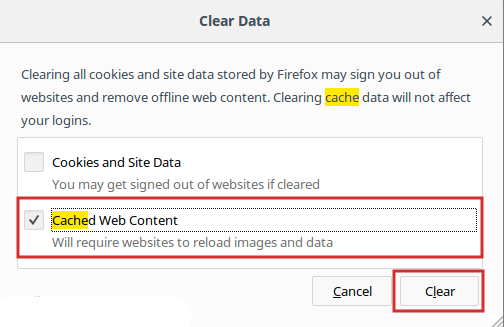 بعد از کلیک روی این دکمه هم پنجره زیر براتون نمایش داده میشه و میتونید کش مرورگر فایر فاکس را پاک کنید. کافیه تیک گزینه Cached Web Content را فعال کرده و در نهایت روی دکمه Clear کلیک کنید.