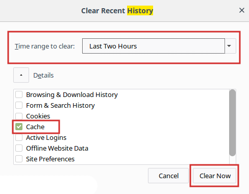 حالا با استفاده از گزینه Time range to clear بازه زمانی دلخواه رو انتخاب کنید. سپس با فعال کردن تیک گزینه Cache انتخاب کنید که فایلهای کش حذف شوند. در نهایت با کلیک روی دکمه Clear Now منتظر بمونید تا بر اساس حجم فایلها عملیت پاک کردن کش مرورگر فایرفاکس انجام بگیره. همچنین میتونید با استفاده از کلیدهای ترکیبی Ctrl + Shift + Delete مستقیما به پنجره پاک کردن حافظه کش در مرورگر فایرفاکس دسترسی پیدا کرده و مشابه تنظیمات فوق بر اساس بازه زمانی، حافظه کش را پاک کنید.