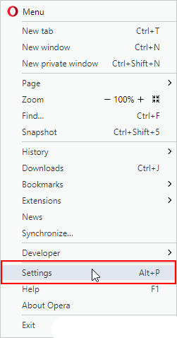 برای پاک کردن کش مرورگر اپرا ابتدا روی آیکون منو مرورگر در گوشه سمت چپ کلیک کنید. سپس روی گزینه Settings کلیک کنید یا اینکه از دکمههای ترکیبی ALT + P استفاده کنید تا به صفحه تنظیمات مرورگر اپرا هدایت بشید.