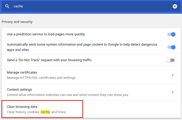بعد از اینکه وارد صفحه تنظیمات شدید، توی باکس جستجو عبارت cache را تایپ کنید تا نتایج جستجو مشابه تصویر زیر براتون نمایش داده بشه. حالا مشابه تصویر زیر روی گزینه Cleare Browsing Data که برای پا کردن دادههای مرورگر گوگل کروم هست کلیک کنید.